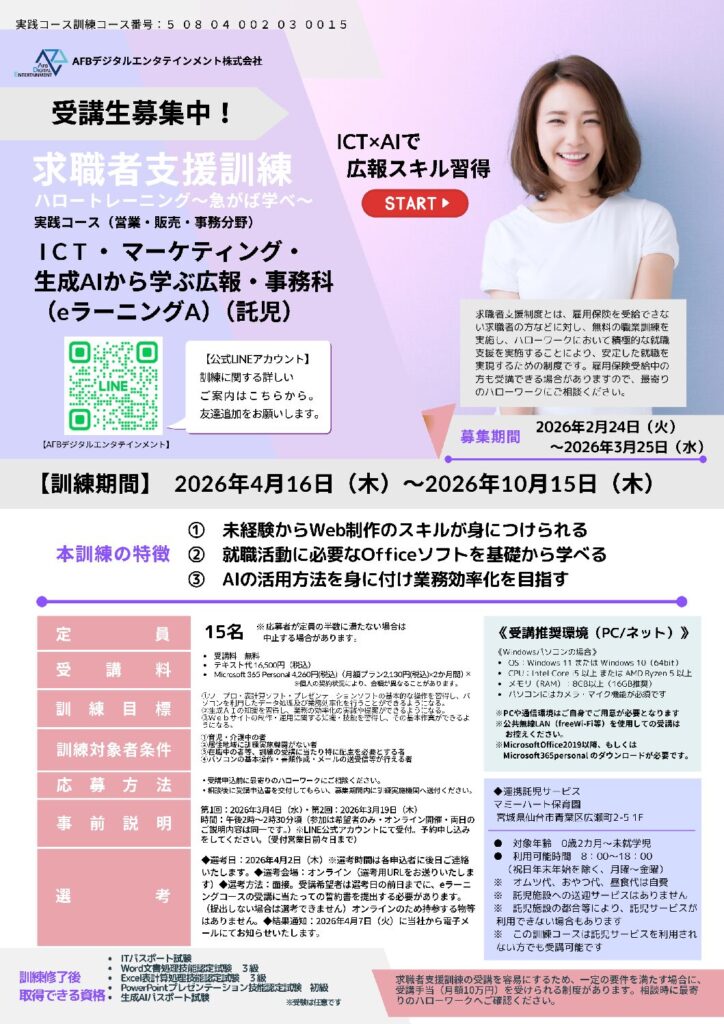 ICT・マーケティング・生成AIから学ぶ広報・事務科(eラーニングA)(託児)
