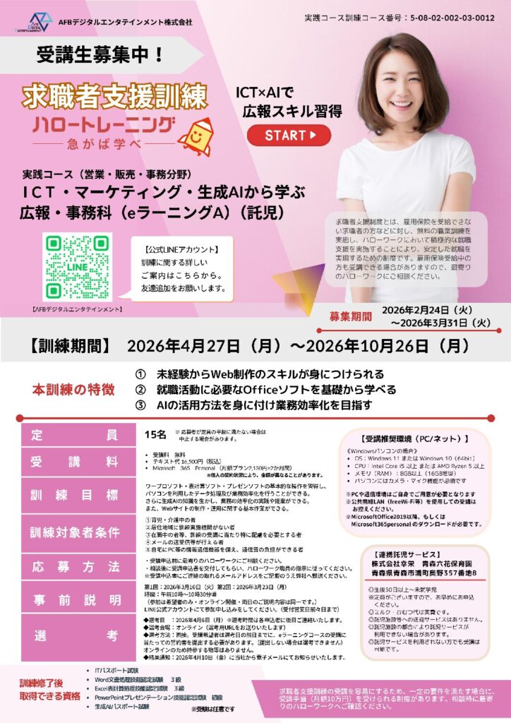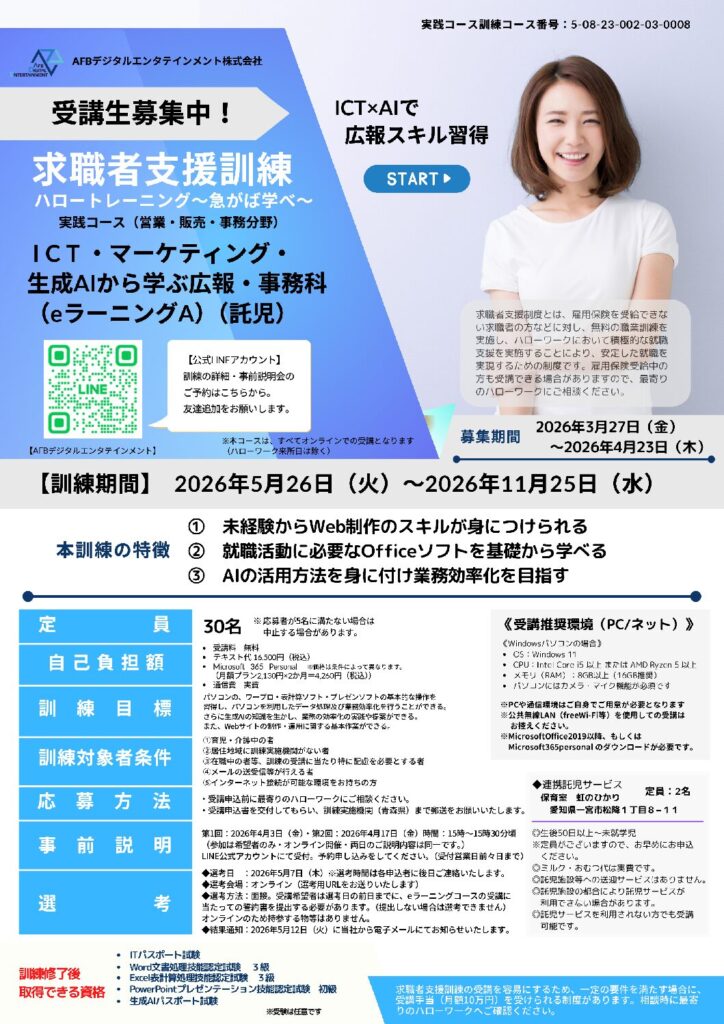 08-0012 ICT・マーケティング・生成AIから学ぶ広報・事務科(eラーニングA)(託児)