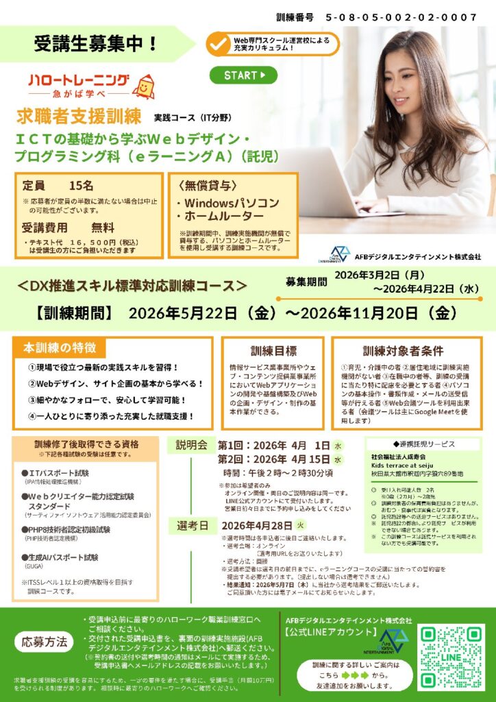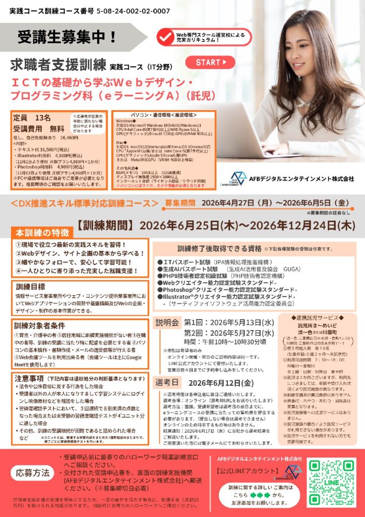 08-0007 ICTの基礎から学ぶWebデザイン・プログラミング科(eラーニングA)(託児)